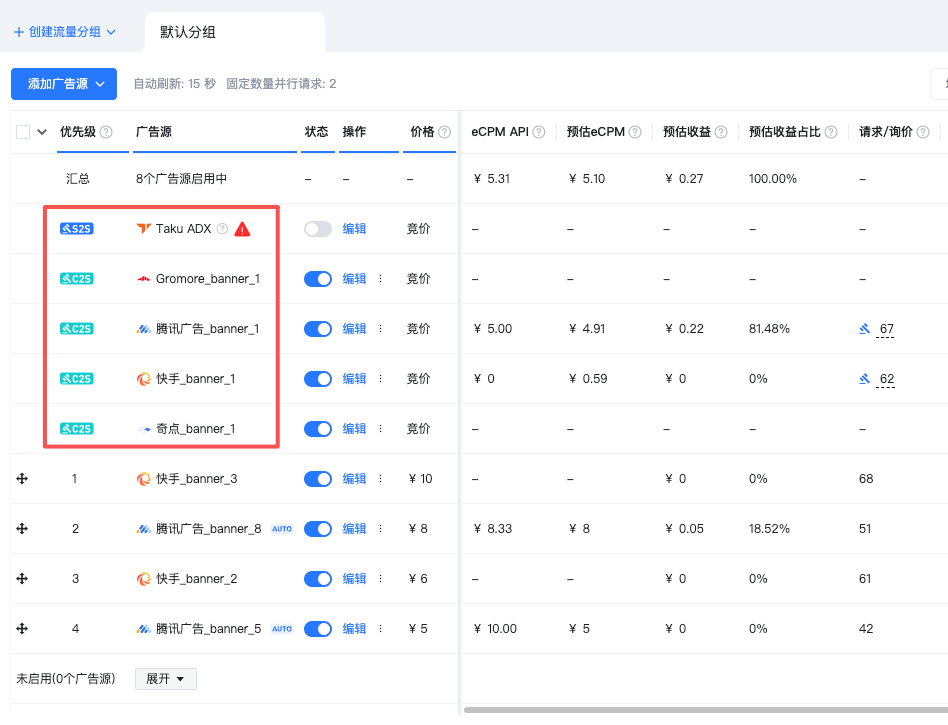 一次load操作通常会请求多个广告源,例如如下广告位配置,包含了红框中的竞价广告源与其余非竞价广告源,如下图所示: